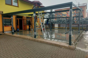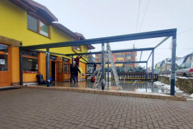 Při této realizaci jsme zastřešovali větší terasu restaurace. Celkový rozměr hliníkové pergoly je 9 x 9,65 m. Jedná se o nadstandardní variantu. Jako zastřešení byl vybrán odolný polykarbonát. V budoucnu je možné boční strany zasklít a interiér ukrýt před silným větrem.