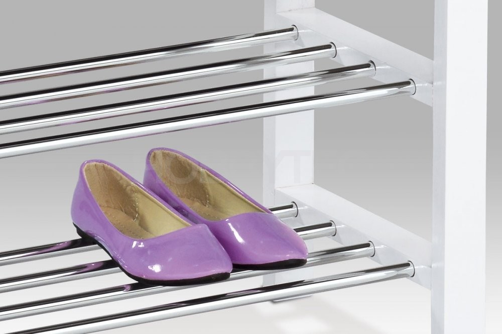 Praktický dřevěný botník s dvěma kovovými rošty, který zároveň slouží i jako sedací lavice. Díky svým rozměrům má ideální ložnou plochu na uložení bot, ale prostorově se vejde i do menších předsíní. Měkký sedák je potažen bílou hladkou ekokůží, výplň je z PU pěny. Kostra botníku je z masivního kaučukovníkového dřeva v černém matném laku. Rošty jsou z kovových chromovaných trubek o průměru 12 mm. Nosnost na sezení je 90 kg, nosnost jednotlivých polic je 6 kg. Dodáváno v demontu.