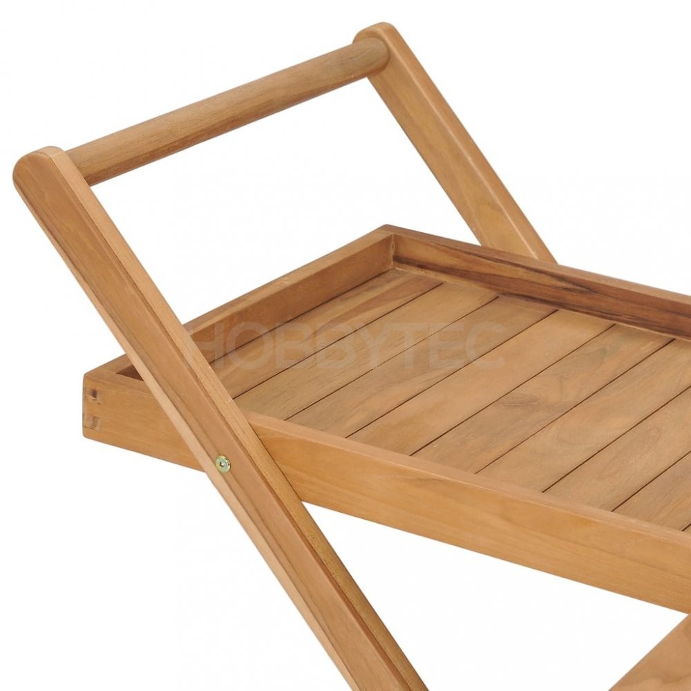 Tento teakový nábytek je zhotovený z extrémně odolného teakového tvrdého dřeva, které již prošlo procesem smršťování, bylo uměle vysušené a poté jemně a dohladka obroušené. Toto dřevo je oceňované pro svou výjimečnou pevnost a klimatickou odolnost, a proto je zdaleka nejvhodnějším materiálem pro výrobu zahradního nábytku. Jedná se o skvělou volbu, pokud si chcete pořídit zahradní vybavení, které vám vydrží sloužit dlouhá léta. Překrásný vozík má horní a spodní poličku, takže nabízí spoustu místa. Na druhé poličce navíc najdete i držák na skleničky, kam můžete bezpečně naskládat sklenice na víno či jiné skleněné nádobí. Servírovací vozík se dá snadno přesouvat z místa na místo, protože má kompaktní design a dobrou pohyblivost.