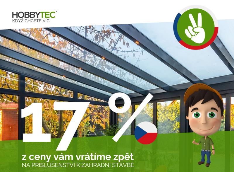 Podrobnosti k akci: zpětný bonus v hodnotě 17 % platí pouze u zakázek vlastní výroby Hobbytec CZ s.r.o.. Maximální výše bonusu je 100 000 Kč vč. DPH. Výše bonusu se počítá z ceny zahradní stavby vč. DPH. Při uplatnění bonusu na výše uvedené příslušenství a služby od Hobbytec CZ s.r.o. se počítá s cenami příslušenství vč. DPH. Bonus lze uplatnit pouze současně s uzavřením zakázky na zahradní stavbu, nelze jej čerpat dodatečně. Nevyčerpaná část bonusu propadá. Bonus lze čerpat pouze na výše uvedené příslušenství a služby od Hobbytec CZ s.r.o., není možné jej uplatnit na jiný sortiment, čerpat ve finanční podobě ani uplatnit jako slevu na zahradní stavbu. Akce je určena pouze pro koncové zákazníky.