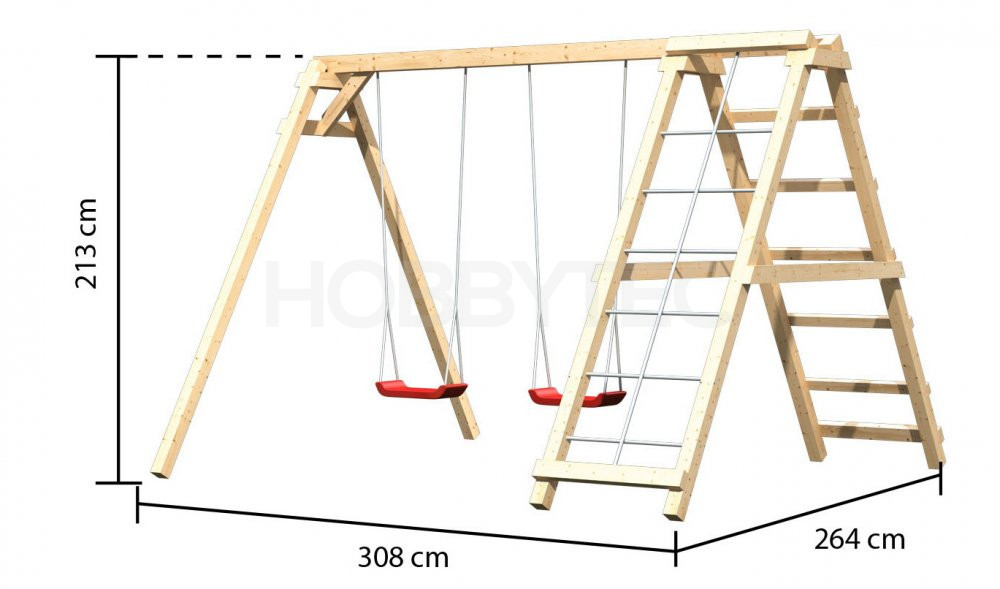 Základní konstrukce sloupů z masivního dřeva o tloušťce 68 x 68 mm je vyrobena z přírodního smrkového dřeva. Také horní příčník je vyroben ze silnějšího trámu 9,0 x 9,0 cm. Pro větší stabilitu jsou na každé straně sloupku nahoře 2 další zesilující vzpěry. Houpací háky i červená houpací sedačka jsou obsahem balení.