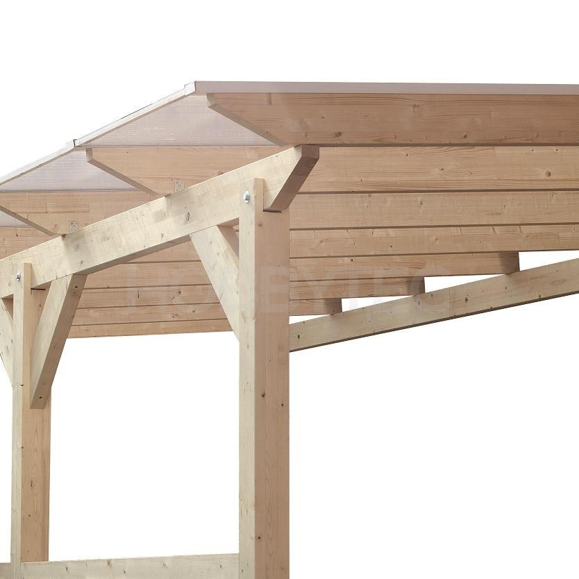 Dřevěná pergola ke zdi, ve které naleznete příjemné místo odpočinku hned vedle vašeho domu. Konstrukce pergoly je z lepeného smrkového dřeva, které se vyznačuje zvýšenou odolností vůči klimatickým vlivům. Nosné sloupy mají zvýšený průměr 12 x 12 cm. Střecha je vyrobená z čirých polykarbonátových dvoustěnných desek síly 10 mm. Smluvní prodloužená záruka 10 let na nerozbitnost polykarbonátu krupobitím je samozřejmostí.