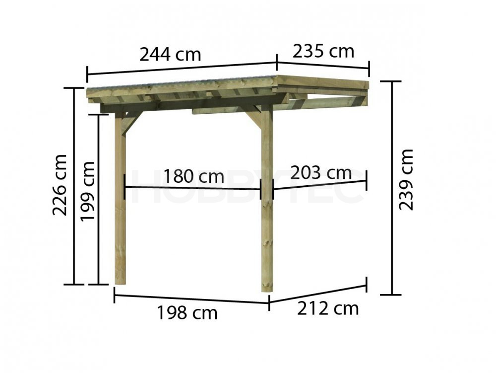 Dřevěná pergola ke zdi, ve které naleznete příjemné místo odpočinku hned vedle vašeho domu. Konstrukce pergoly je z tlakově impregnovaného borovicového dřeva, které se vyznačuje zvýšenou odolností vůči klimatickým vlivům. Nosné sloupy mají průměr 9 x 9 cm. Střecha je vyrobená z lehce namodralých průhledných PVC trapézových desek z PVC (tato verze prosklení nemá záruku na nerozbitnost krupobitím).
