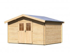 Dřevěný domek se silnou masivní stěnou. Tento model má sedlovou střechu a dvoukřídlé dveře na pantech s oknem v každém křídle. Stavebním materiálem domku jsou profily síly 40 mm perfektně vyfrézované ze severského smrku.