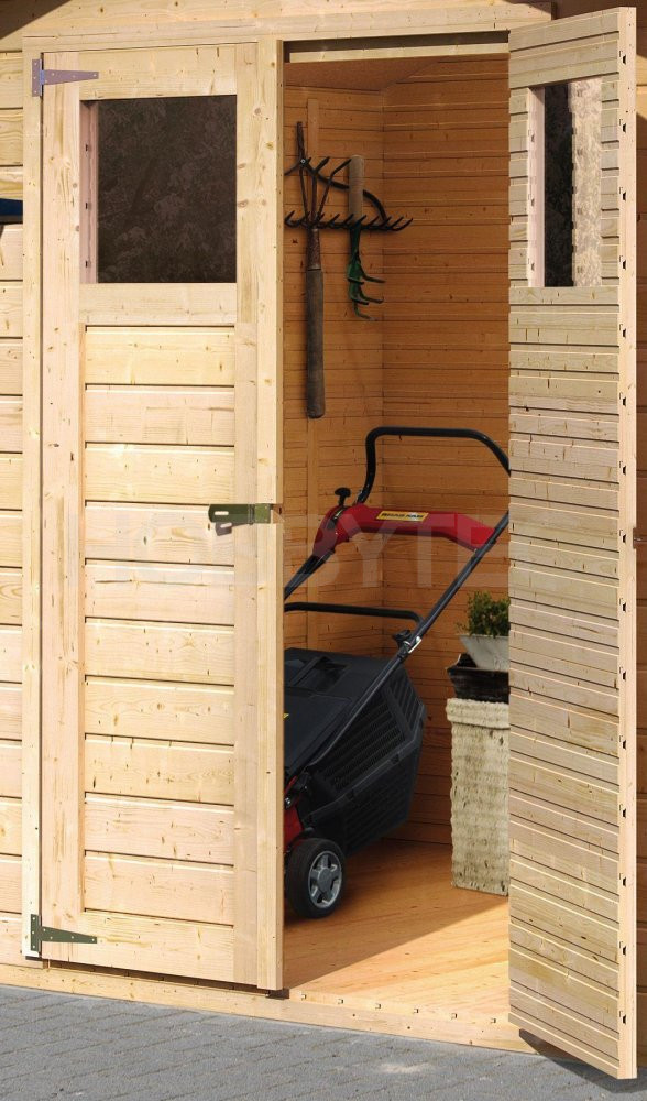 Základní model dřevěného domku pro vaši zahradu. Tento model má sedlovou střechu a dvoukřídlé dveře na pantech s oknem v každém křídle.