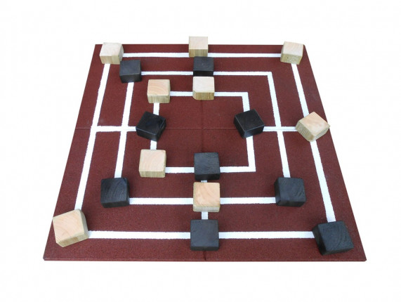 Hra mlýn s figurami - Gumová dlažba v sadě pro vytvoření herního plánu pro společenskou hru "mlýn". Sada obsahuje dřevěné figury.