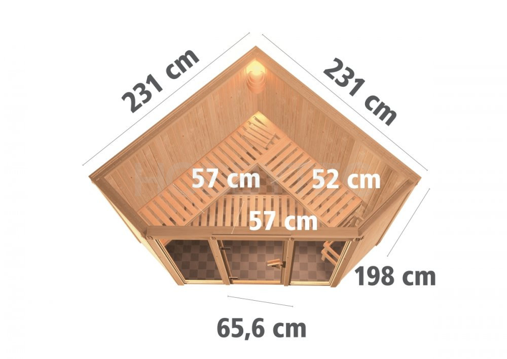 Finská sauna pro tři osoby. Má čtvercový tvar 245 x 245 cm s rohovým vstupem. Saunu dodáváme VČETNĚ střešního věnce s integrovaným LED osvětlením. Tento model finské sauny je určený do temperovaných interiérů domu nebo bytu. Její výrobce, firma KARIBU HOLZTECHNIK z německých Brém, dokázala svými výrobky úspěšně navázat na staletou tradici skandinávského saunování a současně do ní zapracovat dnešní moderní technologie.