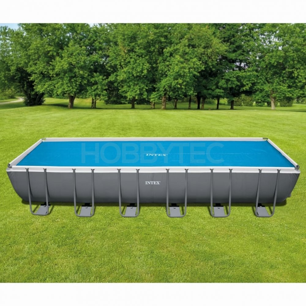 Solární plachta 29027 od značky Intex leží přímo na vodní hladině. Zapadá přesně mezi stěny bazénu a v závislosti na množství přímého slunečního záření v něm dokáže rovněž udržet příjemně teplou vodu.