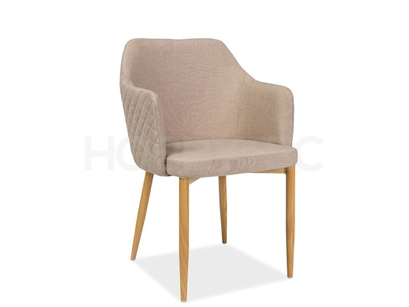 Křeslo je čalouněno látkou ve dvou barevných variantách: béžová a šedá. Zadní strana opěradla má ozdobné prošívání diamantovým vzorem. Podnož je kovová a lakovaná v dekoru: dub.