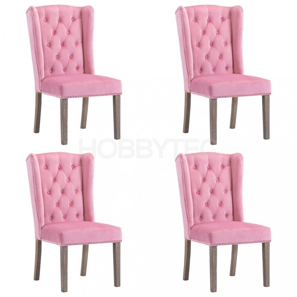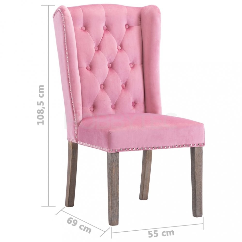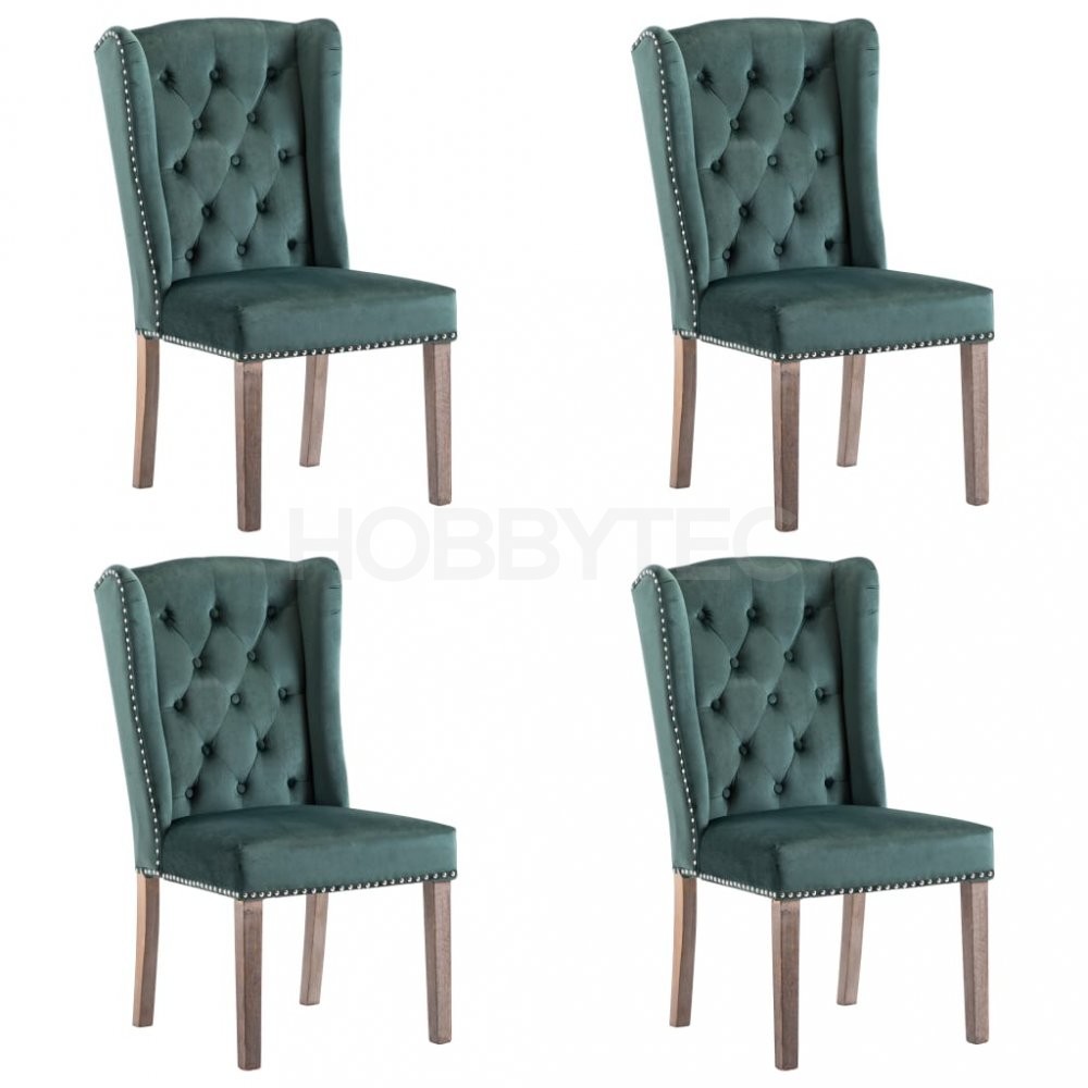 Jídelní židle jsou čalouněné na dotek hebkou sametovou látkou, takže se vám na nich bude moc dobře sedět při stolování, čtení i jen tak u odpočinku. Jejich klasickou krásu zdůrazňují dekorativní knoflíky na opěradle a kovové cvočky podél okrajů. Sedák podepírají nohy z masivního kaučukovníku, židle jsou tedy také stabilní a odolné.