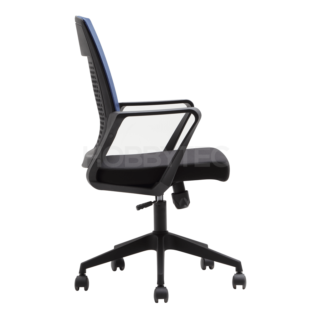 Křeslo je čalouněné látkou v tmavě modré barvě. Elegantně ho doplňuje černá plastová růžice a stejně kvalitní područky. Neodmyslitelnou součástí židle je nastavitelná výška sedu a mechanismus houpání, který vás přivede na úplně jiné myšlenky.