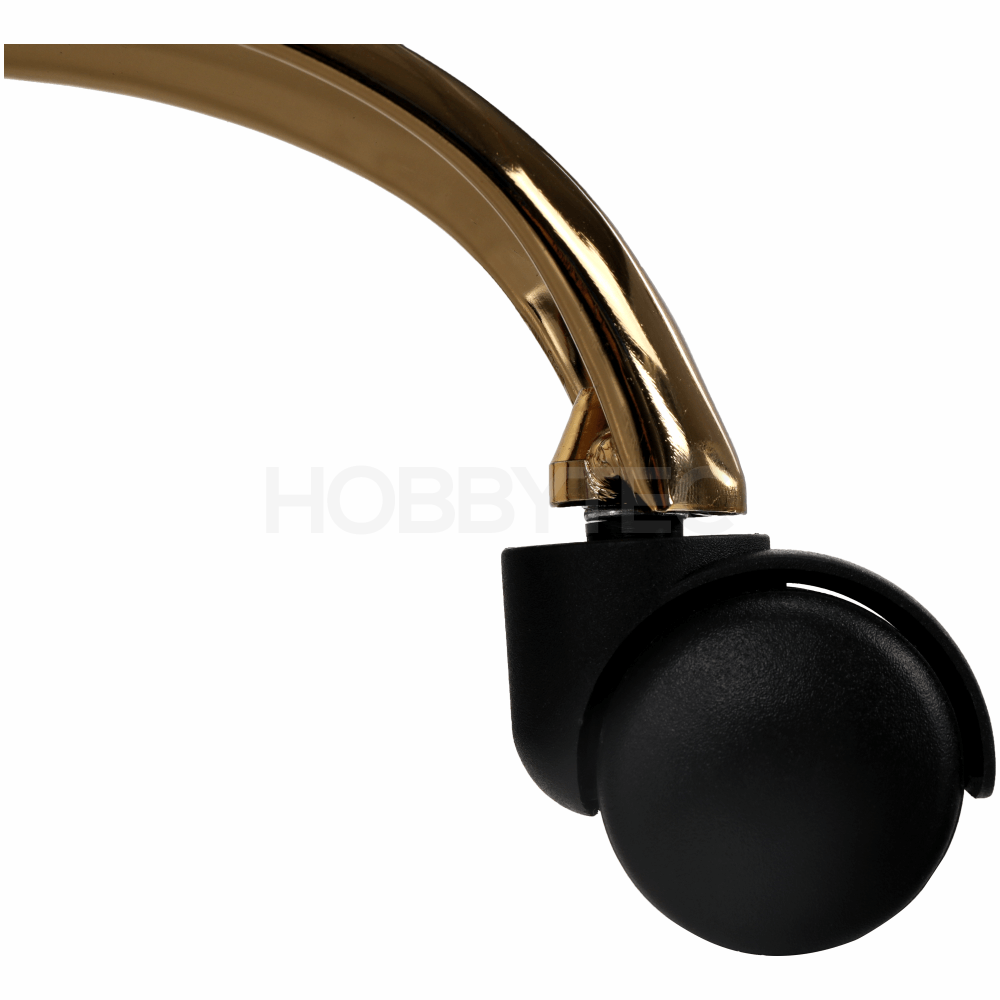 Křeslo stojí na chromové noze s pěti kolečky ve třech barvách: černá, stříbrná a zlatá.