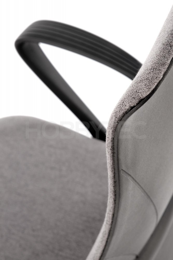 Židle je čalouněná látkou v barevném provedení: šedá / černá. Disponuje plastovou růžicí zakončenou plastovými kolečky, černými opěrkami na ruce z plastu a prodlouženou opěrkou hlavy.