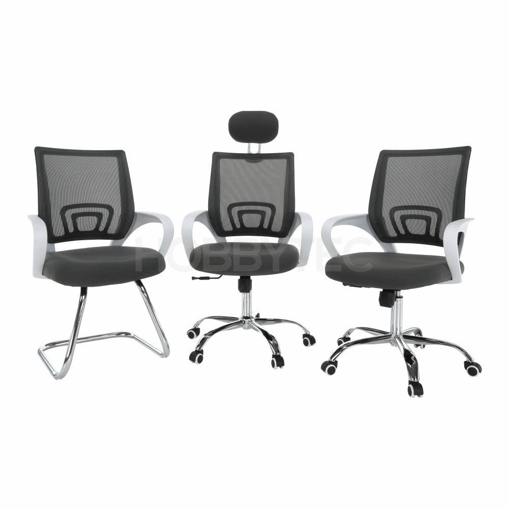 Křeslo je vyrobené v kombinaci bílého plastu a kovu v chromové úpravě. Čalouněné je síťovinou v barevném provedení: šedá. Výhodou síťoviny je její prodyšnost, což zabezpečuje plynulou cirkulaci vzduchu. Zádová opěrka je z vnější strany v bederní části zpěvněná plastovou opěrkou. Křeslo disponuje pogumovanými kolečky, područkami, nastavitelnou výškou sedu, houpacím mechanismem a opěrkou hlavy.