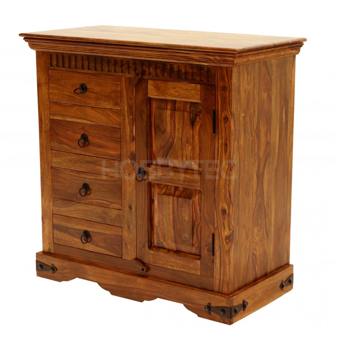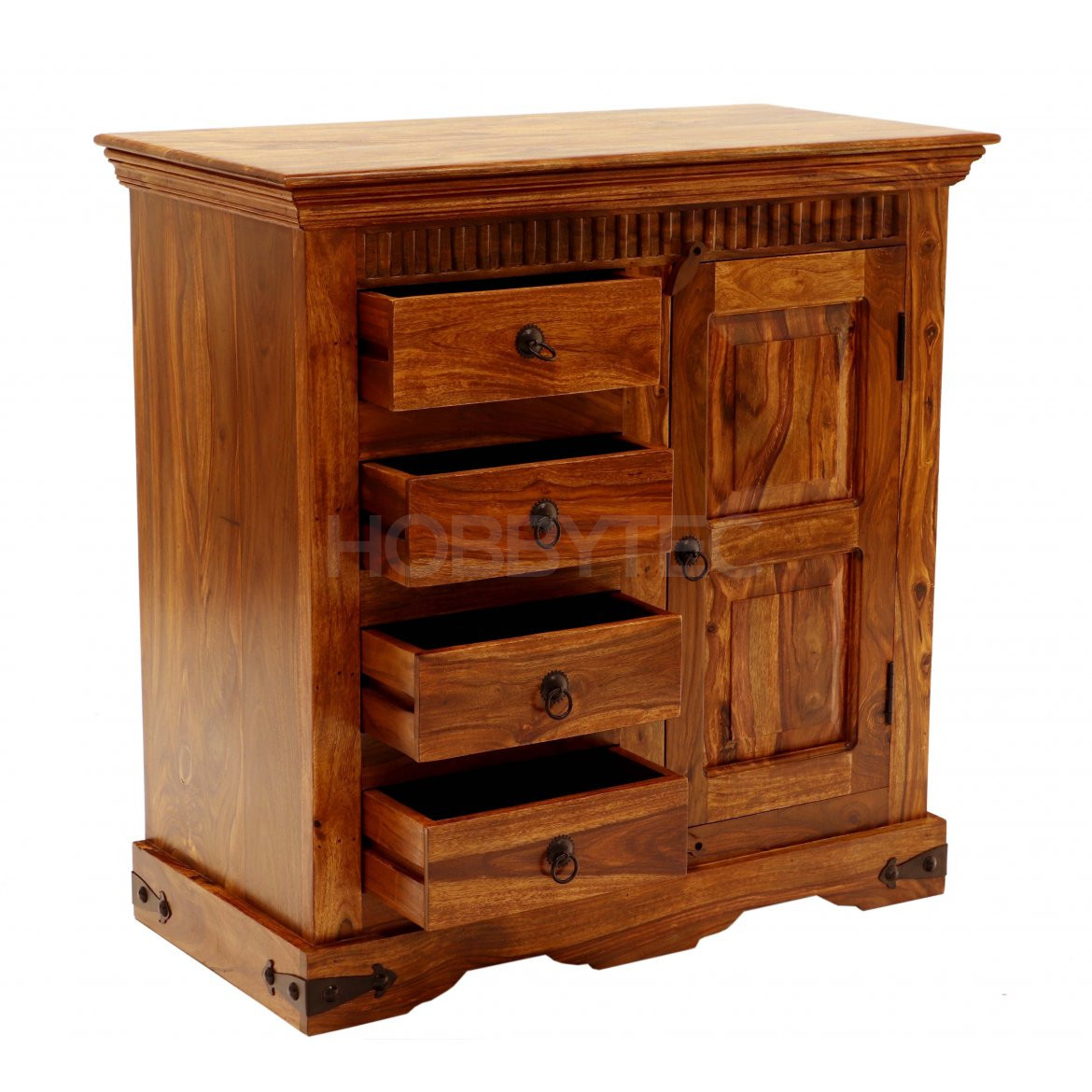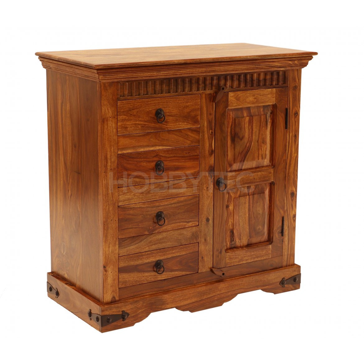Komoda z masivu má 4 zásuvky a 1 vyřezávaná dvířka, úchyty kované. Vyrobena z indického palisandru. Komody z masivu, které máme skladem, si můžete prohlédnout v našem showroomu. Indický koloniální nábytek palisandr (sheesham) masiv.