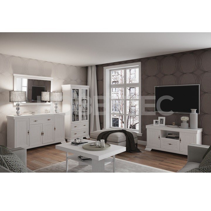 Komoda KORA KK4 je kombinovaná se šuplíkem. Úložný prostor poskytují další dvě boční skříňky a střední skříňka. Skříňky jsou jednou policí rozděleny na dvě odkládací plochy.