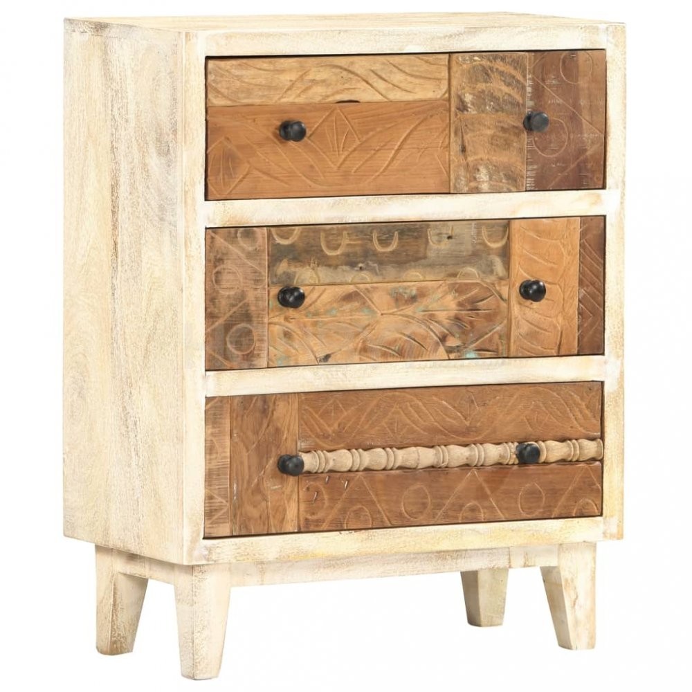 Zásuvky s ručně vyřezávaným vzorem na čelní straně jsou zhotovené z recyklovaného dřeva, které je nejen pevné a odolné, ale zároveň také krásně vypadá. Navíc si zachovává vlastnosti celé řady různých dřevin, jako jsou teak, palisandr, mangovník, akácie, tvrdé dřevo apod. Zručné řemeslné zpracování a nádherná kresba dřeva dávají každému kusu nábytku jedinečný charakter, jímž se lehce liší od všech ostatních. Každý krok výrobního procesu je prováděný s tou největší péčí, ať už se jedná o leštění, natírání nebo lakování. Skříňka má tři zásuvky a nabízí spoustu prostoru pro přehledné uložení nejrůznějších menších věcí, které chcete mít na dosah ruky. Sestavení produktu je snadné.