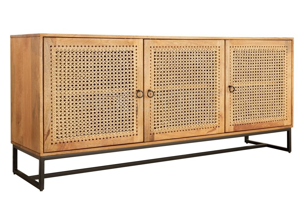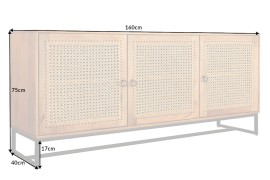 Komoda ve venkovském stylu je kombinací mangovníkového dřeva, ratanu a černého kovového rámu. Konstrukce je pevná, kovová a dodává stabilitu celému stolku. Korpus stolku je z masivního dřeva a ratanu, zadní panel je z MDF.