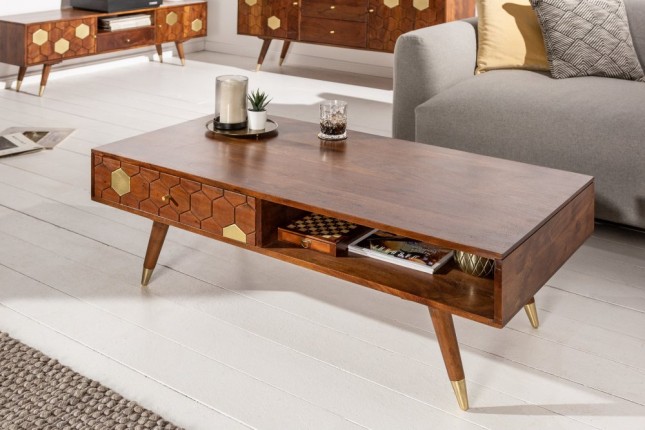 KLEOPATRA je stolek ve stylovém designu s plástvemi a zlatými aplikacemi. Vyroben je z vysoce kvalitního masivního akáciového dřeva. Stojí na čtyřech nohách se zlatými koncovkami, což jí dodává nádech retra. Stůl disponuje dvěmi zásuvkami a odkladacím, prostorem.