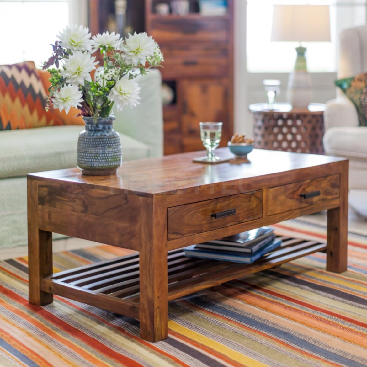Konferenční stolek z masivu s 2 zásuvkami, je vyroben z indického palisandru. Konferenční stolky z masivu, které máme skladem, si můžete prohlédnout v našem showroomu. Indický koloniální nábytek palisandr (sheesham) masiv.
