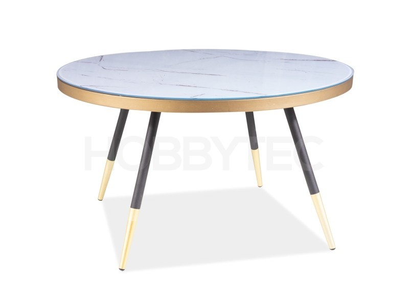 Elegantní konferenční stolek VEGA B s nádechem art-deco stylu je vyrobený z kvalitní MDF desky a skla v dekoru: bílý mramor. Stabilitu zajišťují čtyři černé kovové nohy se zlatými konci.
