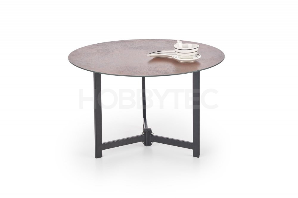 Je zhotoven v kombinaci skleněné desky v designu imitace kamene a nohou z černě lakované oceli.