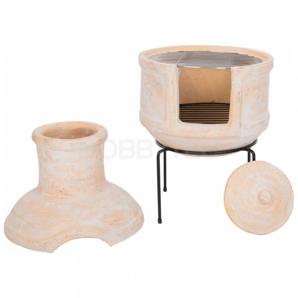 Krb je dodáván s robustním ocelovým stojanem. Součástí je také ochranný hliněný kryt, který chrání komín před deštěm. Chcete-li ochránit svůj zakoupený krb před nepřízní počasí ještě účinněji, pořiďte si krycí plachtu Chimeneas M od značky Redfire, která není součástí dodávky.