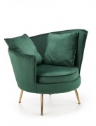 Křeslo je čalouněné sametovou látkou Velvet ve třech barevných variantách: růžová, tmavě zelená a černá. Stojí na čtyřech nožičkách z chromované oceli ve zlaté barvě. Křesílko je doplněno o dva příjemné dekorativní polštářky.