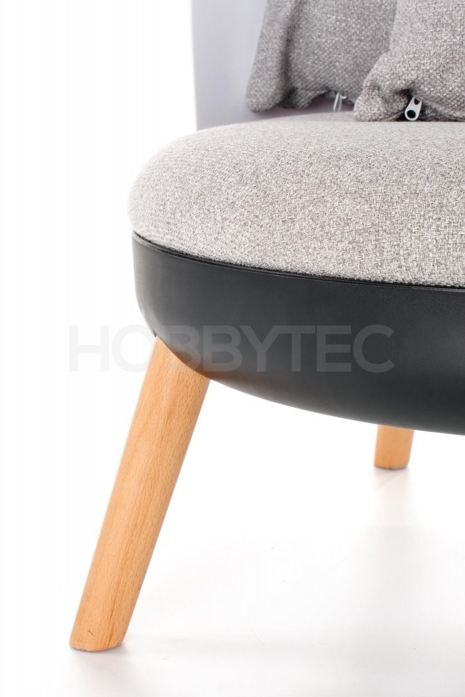 Křeslo je vyrobené v kombinaci polypropylenu a látky v barevném provedení: bílá / šedá / černá. Součástí křesla jsou polštářky, které zpříjemňují komfort sezení. Křeslo stojí na podnoži z masivního dřeva v přírodní barvě.