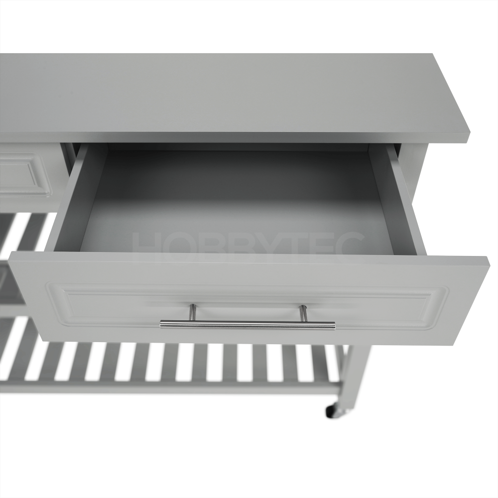Součástí vozíku jsou dvě zásuvky, ze kterých si pohodlně vyberete cokoli, co budete potřebovat. Zásuvky zdobí kovové rukojeti v chromovém provedení. Pod šuplíky jsou dvě poličky, které nabízejí dostatek úložného prostoru.
