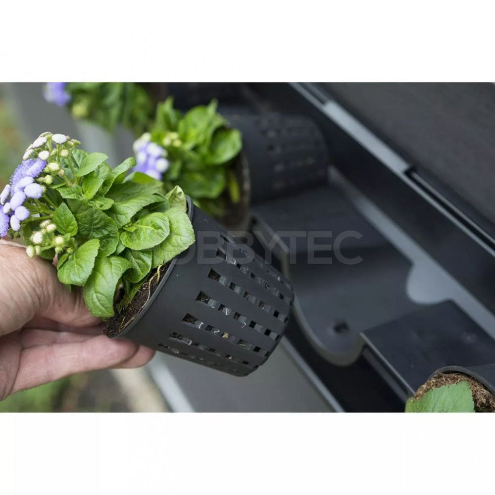 Tato sada obsahuje 3 tyče, 12 vyjímatelných květináčů, žlábek a zavlažovací systém. Závěsné tyče snadno upevníte ke zdi hmoždinkami a nerezovými šrouby, které jsou součástí balení. Vyjímatelné květináče jsou velmi praktické, jelikož usnadňují sázení i přesazování.