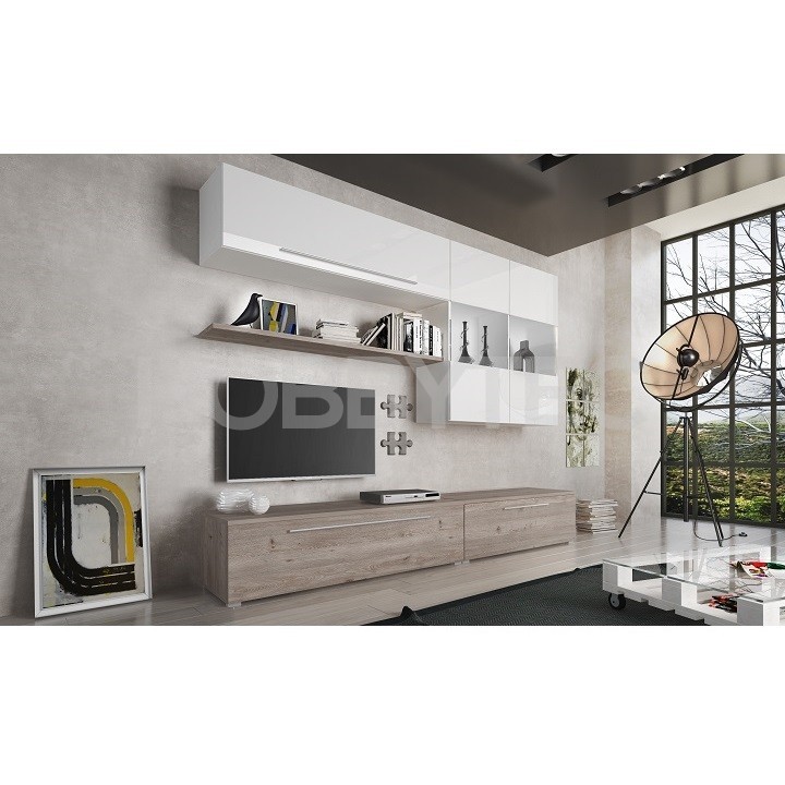Obývací stěna SOFI v provedení kombinace dub nelson / bílá extra vysoký lesk HG oživí každou obývací místnost.
