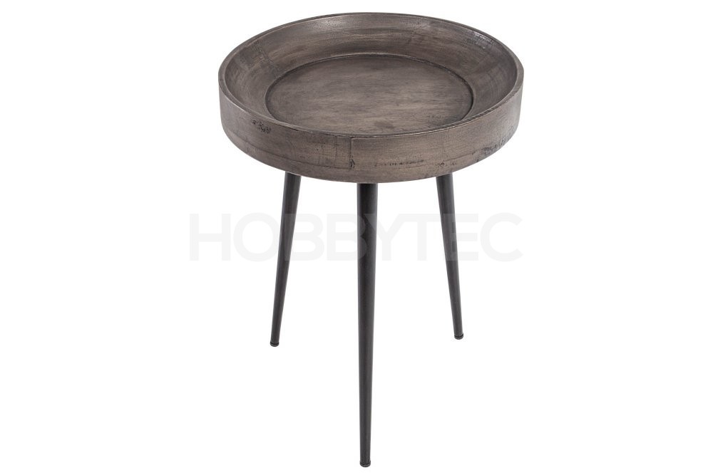 Tři černé kovové nohy jsou doplněny kulatou, šedou stolní deskou z kvalitního akáciového masivu.