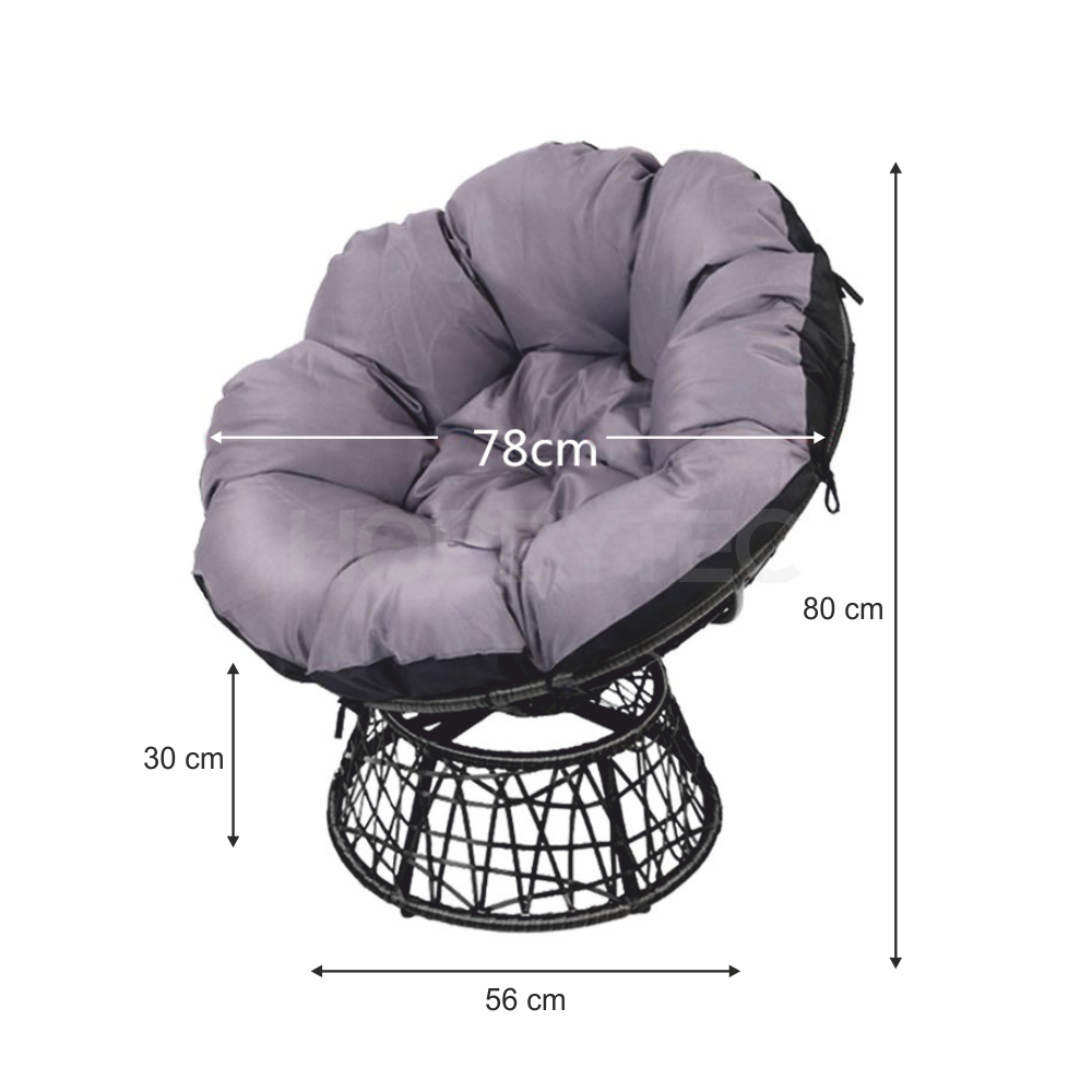 Křeslo je vyrobené z pevné ocelové konstrukce v černé barvě, na kterou je vypletený umělý ratan, který na první pohled působní jako pravý, ale je odolnější. O pohodlí se stará extra velký měkký polštář, kterýn se ke konstrukci upevňuje šňůrkama. Potah na polštáři je voděodolný. Křeslo nabízíme ve třech barevných variantách: hnědá / černá / béžová, bílá / petrolejová a šedá / černá / světle šedá.