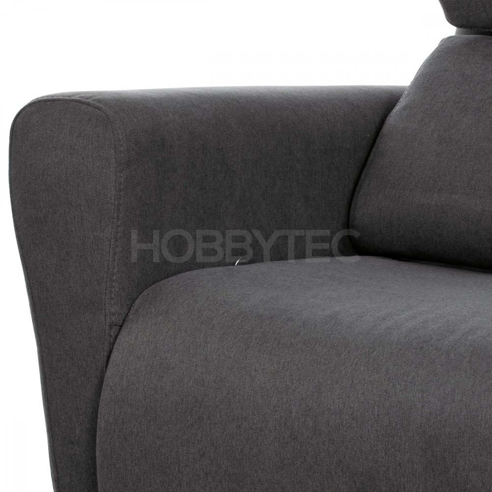 Multifunkční relaxační TV křeslo v látkovém potahu ve světle šedém barevném odstínu. Svým designem se řadí do retro stylu s moderními prvky ovládání.