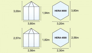 Pavilon HERA 9000 je zařazený do kategorie PREMIUM - skleník je vyrobený značkovým výrobcem z Velké Británie. Skleník je vyrobený z eloxovaných hliníkových profilů. Prosklení je z klasického čirého bezpečnostního skla síly 3 mm (stěny) a z nerozbitného komůrkového polykarbonátu 6 mm (střecha). Polykarbonát - vysoce kvalitní dvoustěnný polykarbonát s UV filtrem (nekřehne, nežloutne) od evropského výrobce. Polykarbonát i sklo jsou do hliníkových profilů uchycené pomocí ocelových sponek. Součástí pavilonu je i pozinkovaná ocelová základna o výšce 6 cm. Na nerozbitnost polykarbonátu krupobitím poskytujeme prodlouženou záruku v délce 10 let.