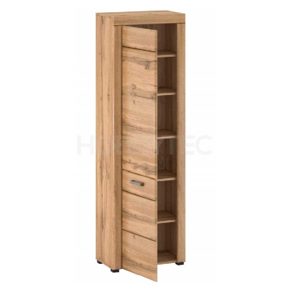 Předsíňová skříň PUSAN V krásně zapadne do vaší předsíně. Nenahraditelný pomocník pro udržení pořádku a uspořádání šatstva. Vyrobena je z laminované DTD a MDF s tloušťkou materiálu až 1,9 cm v provedení dub Apalačský. Je jednodveřová, pro snadnější manipulaci její výrobce dopřál šedou kovovou úchytku. Na odkládání věcí prakticky poslouží pět polic. Stabilitu jí zajistí dřevěné nožičky, na kterých je postavena.