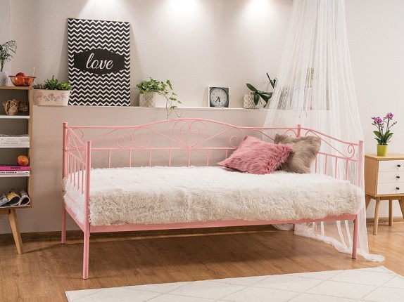 Romantická postel BIRMA 90 se hodí do dětských či studentských pokojů. Součástí postele je kovový rošt.