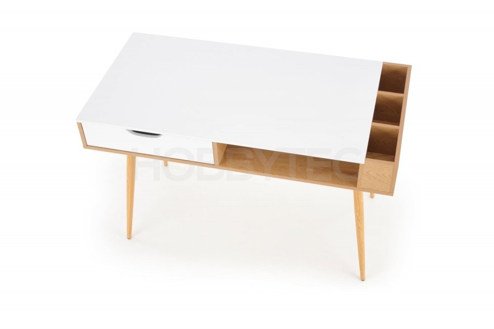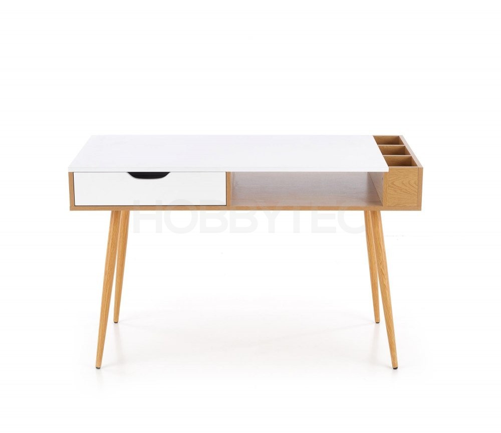 Designový psací stůl B45 je vyrobený z MDF v barevném provedení: dub zlatý / bílá. Stabilitu zajišťuji čtyři nohy v dekoru: dub zlatý.