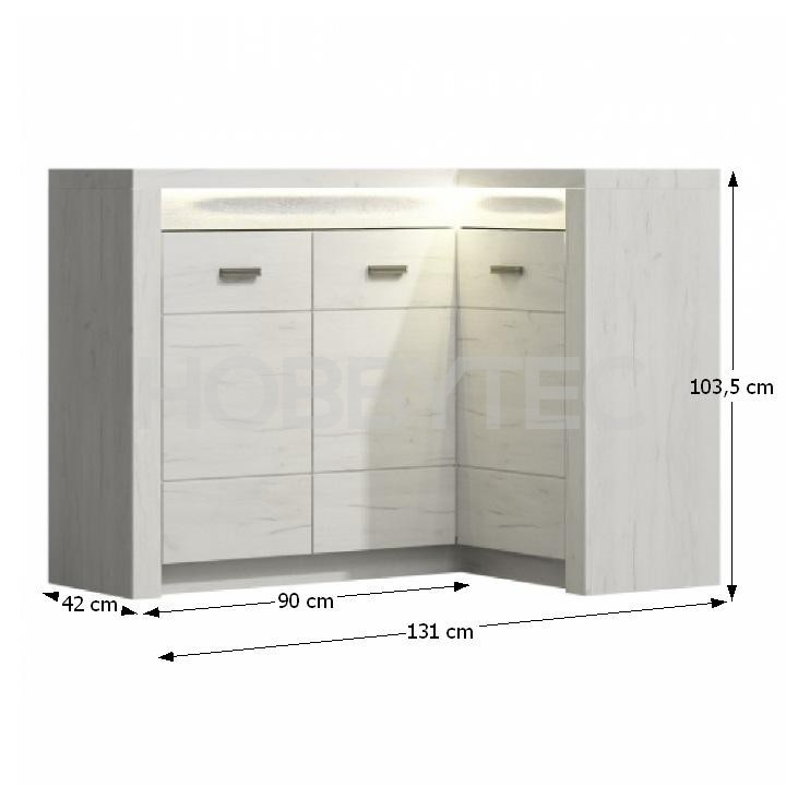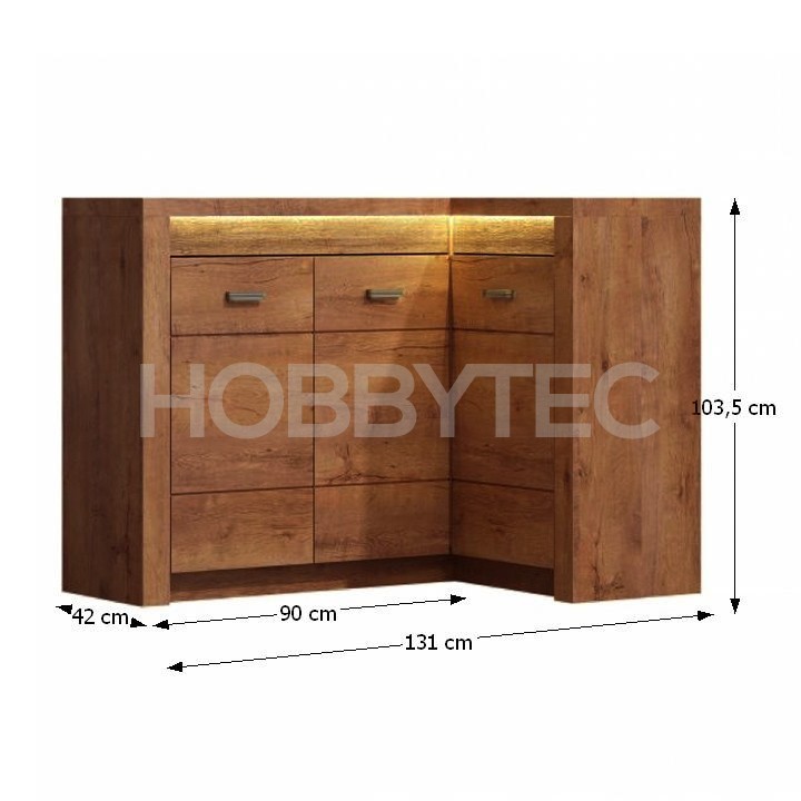 Rohová komoda INFINITY I-15 disponuje levou dvoudveřovou skříňkou s jednou poličkou a pravou jednodveřovou skříní. Podsvícená deska je vyrobena z masivního dřeva.