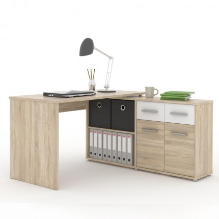 Rohový psací stůl RAFAEL NEW s úložným systémem sestaveným ze dvoudvířkové skříňky s policí, dvou šuplíků a otevřeným regálem.