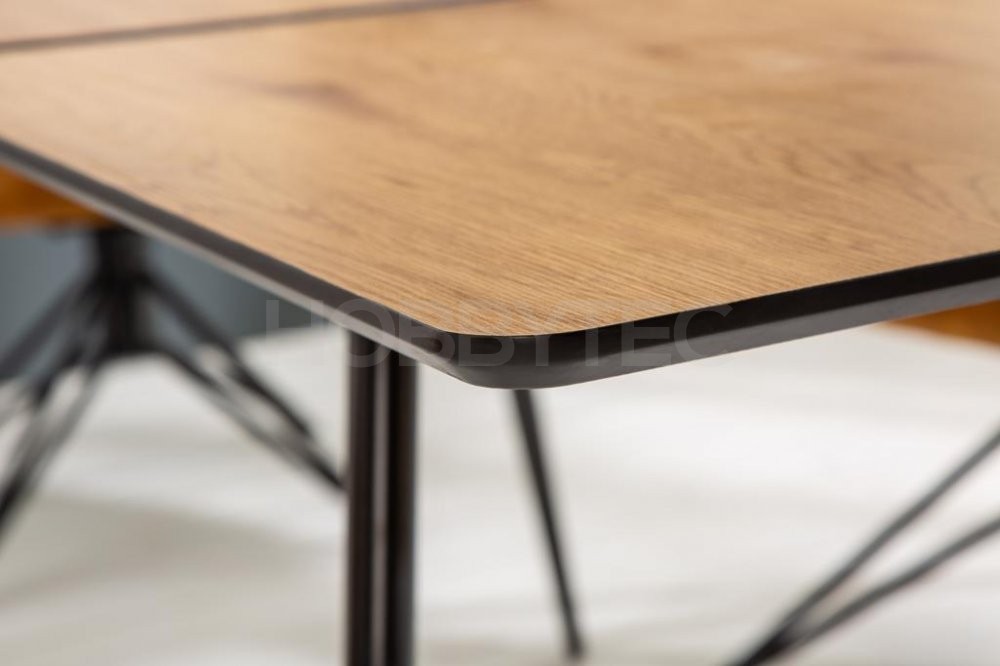 Stolní deska je vyrobena z kvalitní foliované MDF v dekoru dub nebo dub sonoma. Nohy jsou kovové, práškově lakované černou barvou.