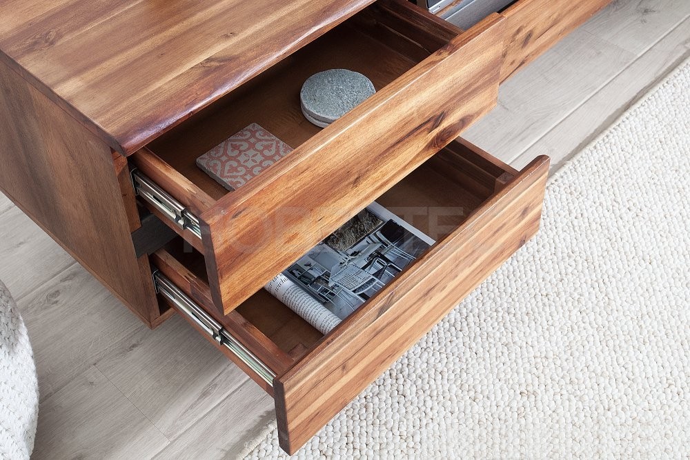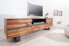 Moderní, jedinečný a nadčasový TV stolek TALOS je vyroben z masivního akáciového dřeva a stojí na stabilním železném rámu.