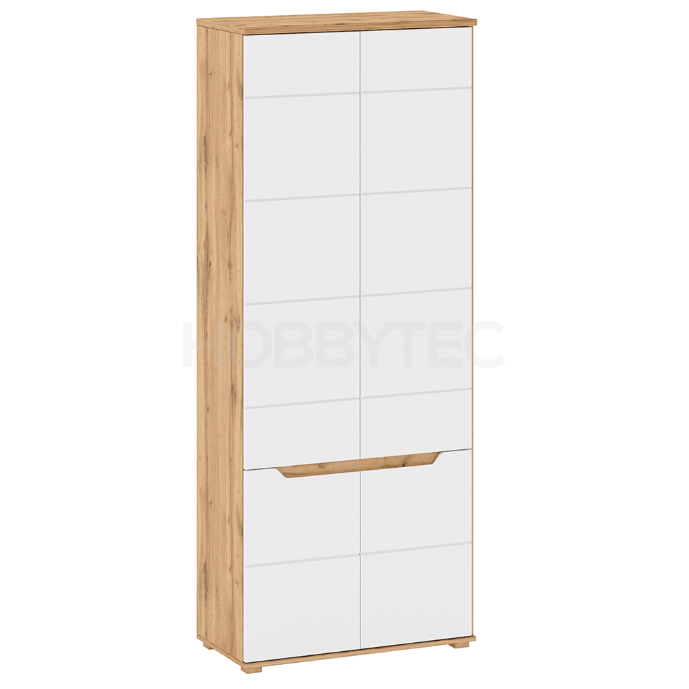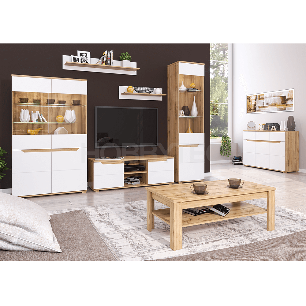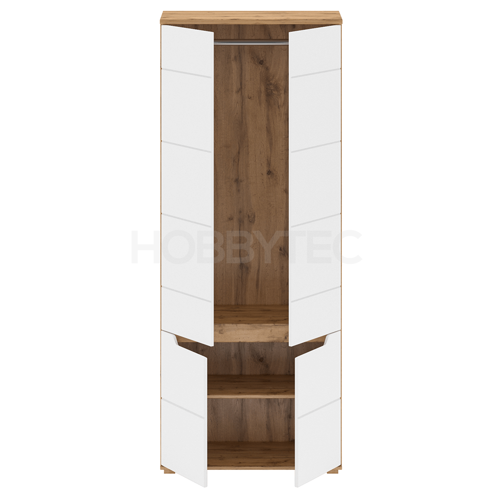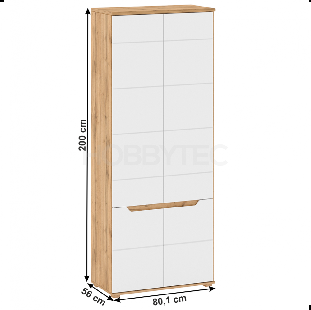 Šatní skříň F je součástí sektorového systému VINCO, který nabízí množství komponentů na vybevení obývacího pokoje. Nábytek je vyrobený z laminované DTD v kombinaci s MDF a ABS hranami, které zaručují dlouho životnost, v elegantní a moderní barevné kombinaci: dub wotan a bílá extra vysoký lesk HG.