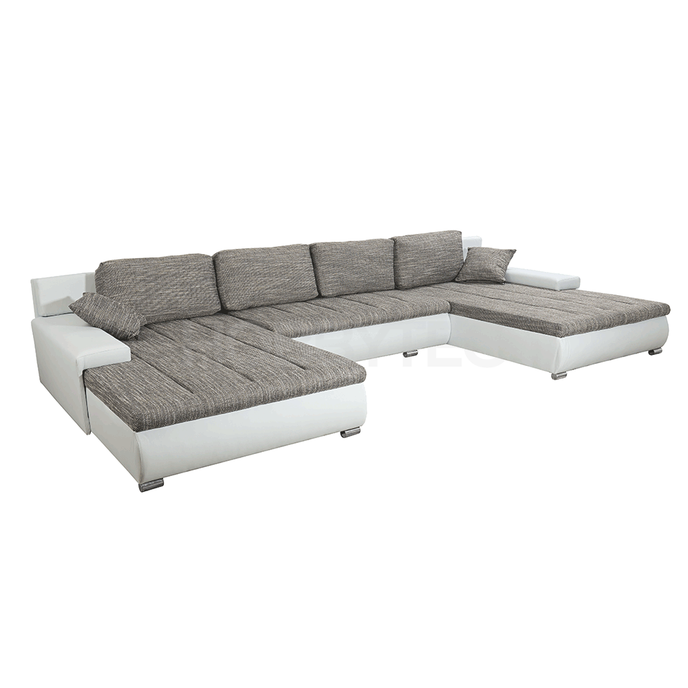 Rohová rozkládací sedací souprava TONIKS U UNI ve tvaru U s úložným prostorem včetně polštářů, poskytne dostatečný komfort. Mimořádně velká sedačka s šířkou 420 cm zajistí místo k sezení pro všechny členy rodiny. Spodní část sedačky, opěrky na ruce a opěrná část jsou v bílé ekokůži. Sedací část a polštáře jsou v látce v barevném provedení šedý melír. Ekokůže a látka šenil jsou odolné materiály nenáročné na údržbu.