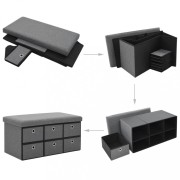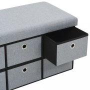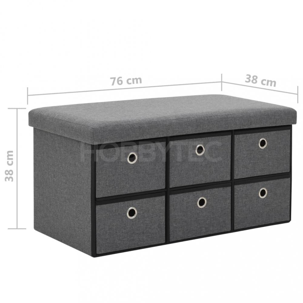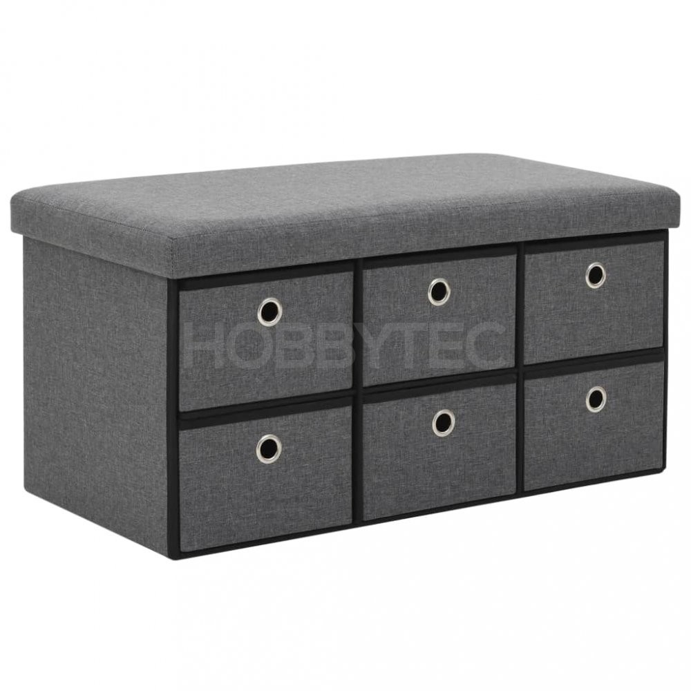 Úložná lavice je vyrobena z MDF a její pohodlný polstrovaný sedák je čalouněný umělým lnem. Díky šedé barvě čalounění nejsou případné skvrny či prach na první pohled vidět. Je vybavena 6 zásuvkami pro ukládání velkého množství věcí a potřeb, které si nepřejete mít na očích, ale přitom je chcete mít po ruce.