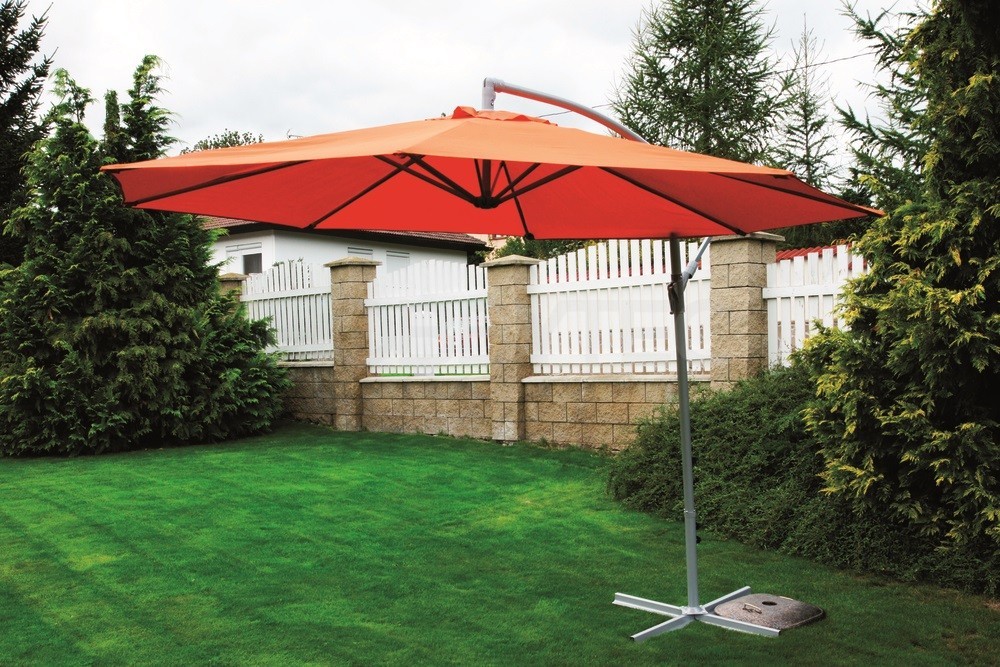 Slunečník EXCLUSIVE o průměru 300 cm s bočním zavěšením na konstrukci z kovu s vlastním podstavcem.