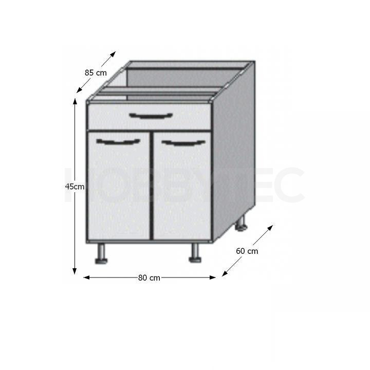 Spodní skříňka JURA NEW D-80 S1 je s jedním šuplíkem a dvěma dvířky, která se otevírají pomocí plastových úchytek.