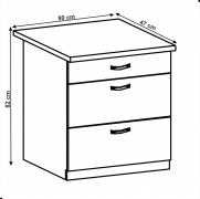 Spodní skříňka LAYLA D80S3 je se třemi šuplíky a nabízí tak dostatek úložného prostoru. Šuplíky jsou s ozdobnou úchytkou. Skříňka je bez pracovní desky a spodního soklu.