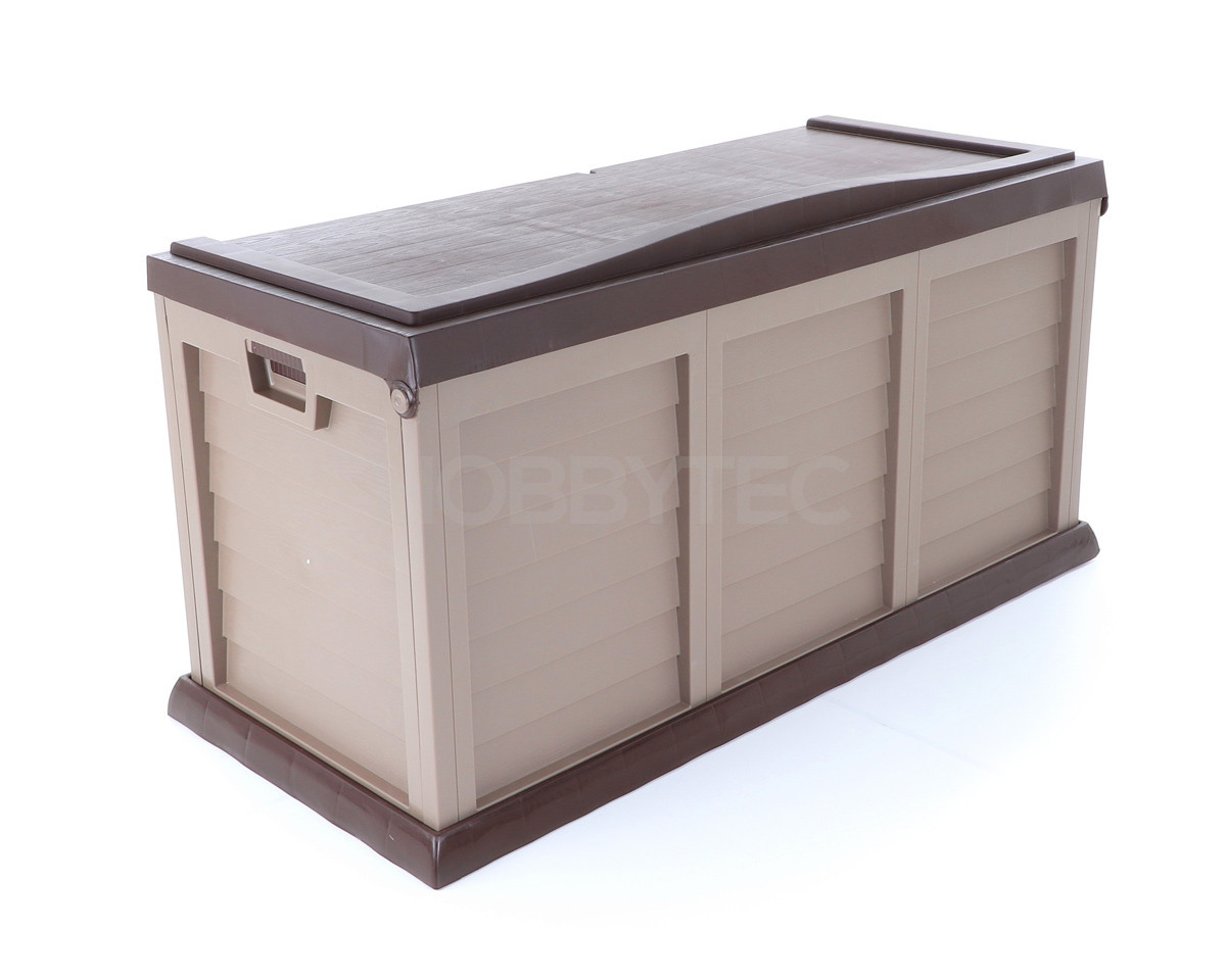 Velmi praktický úložný box s velkým objemem, který je praktický na zahrady, terasy, balkóny, do garáže nebo zimní zahrady na uskladnění podušek ze zahradního nábytku, hraček apod. Lze jej umístit do exteriéru i interiéru.